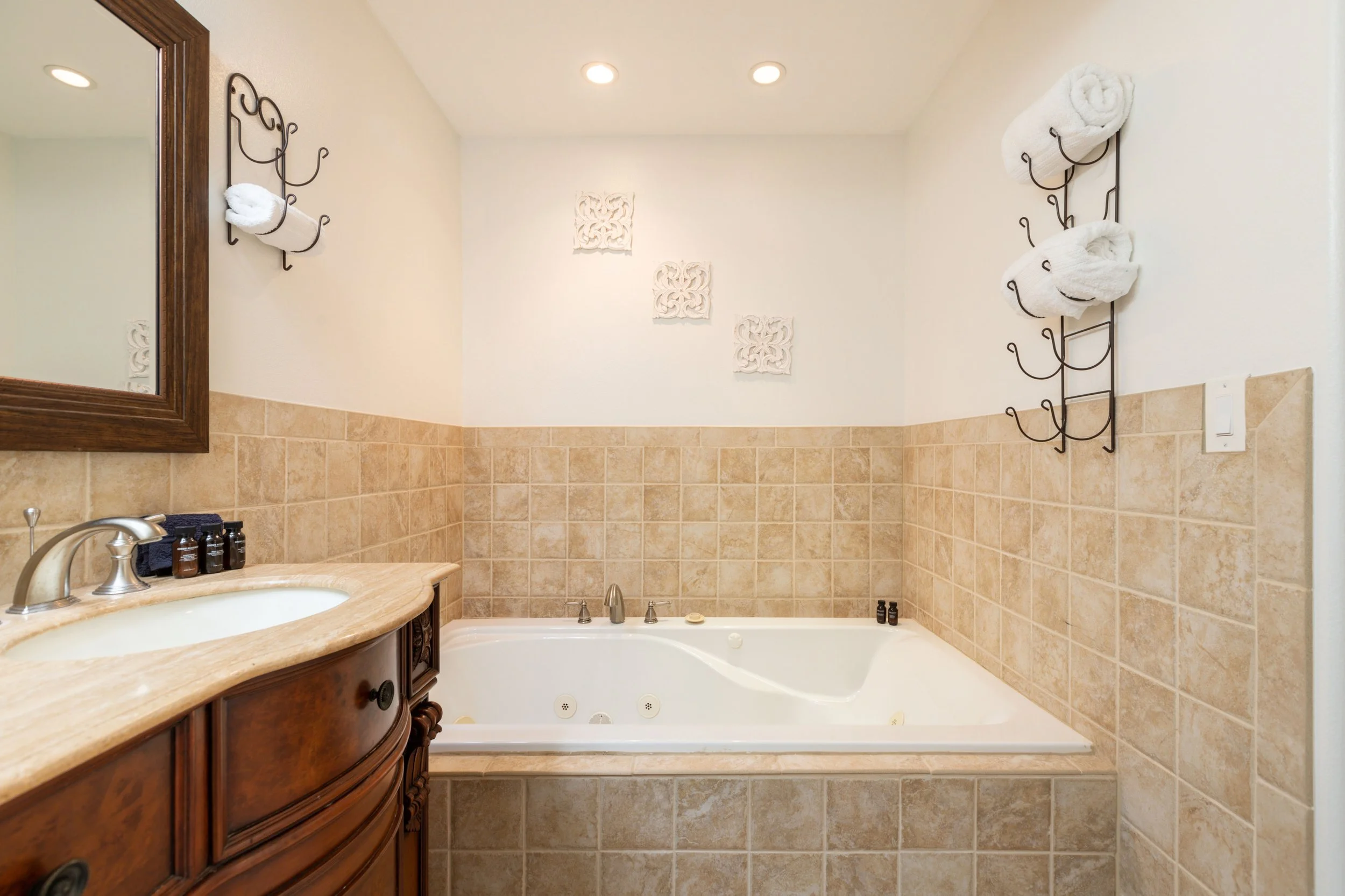 Luxurious bathroom with wooden vanity, double sinks, large mirror, and a whirlpool bathtub, featuring tile walls and decorative elements.