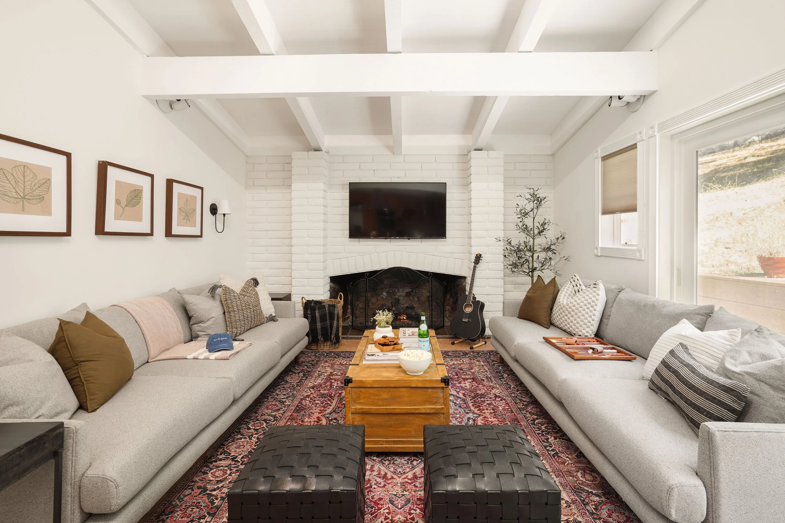 Cozy living room with white brick fireplace, framed leaf prints, gray sofas, wooden coffee table, acoustic guitar, and decorative cushions on a patterned rug.