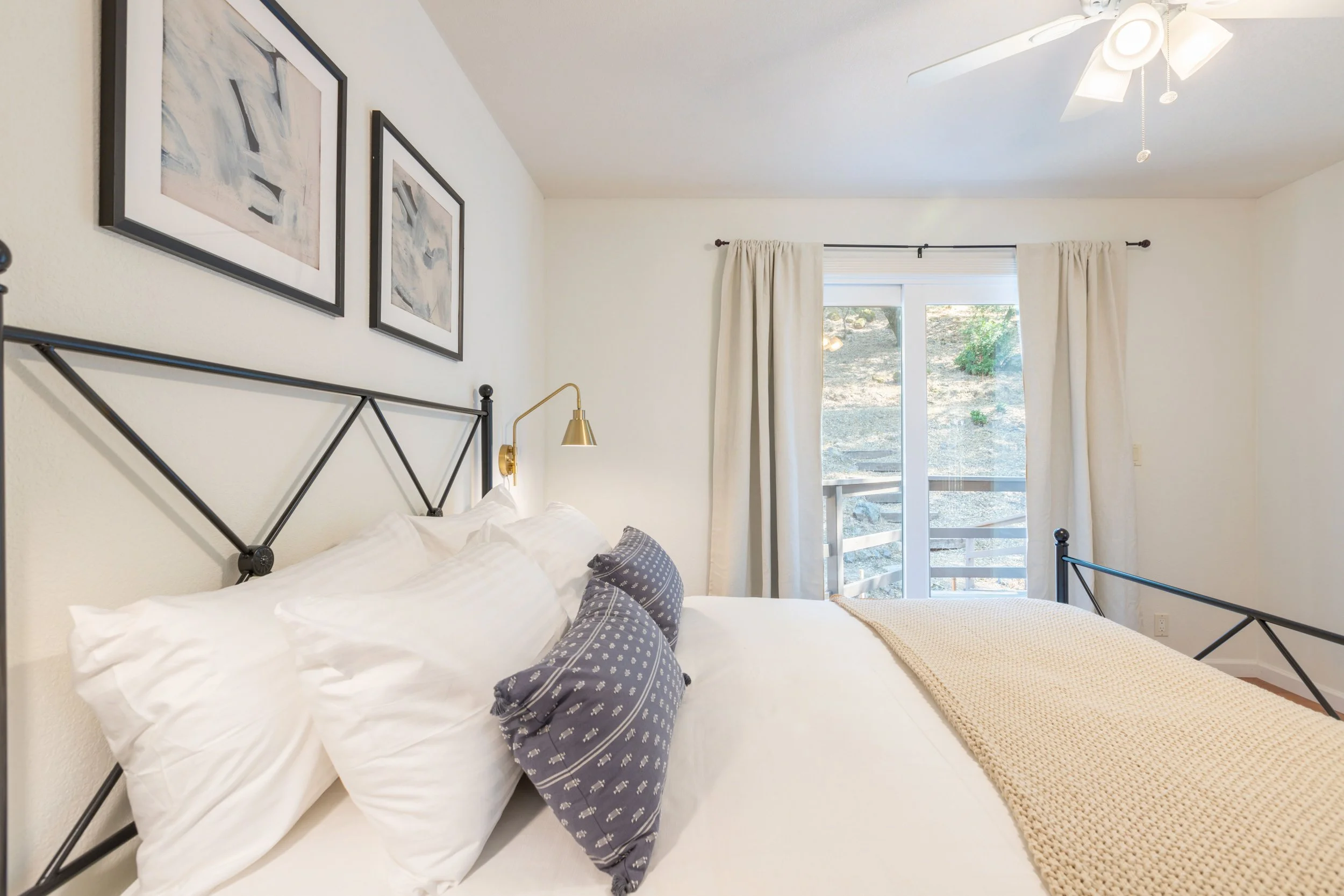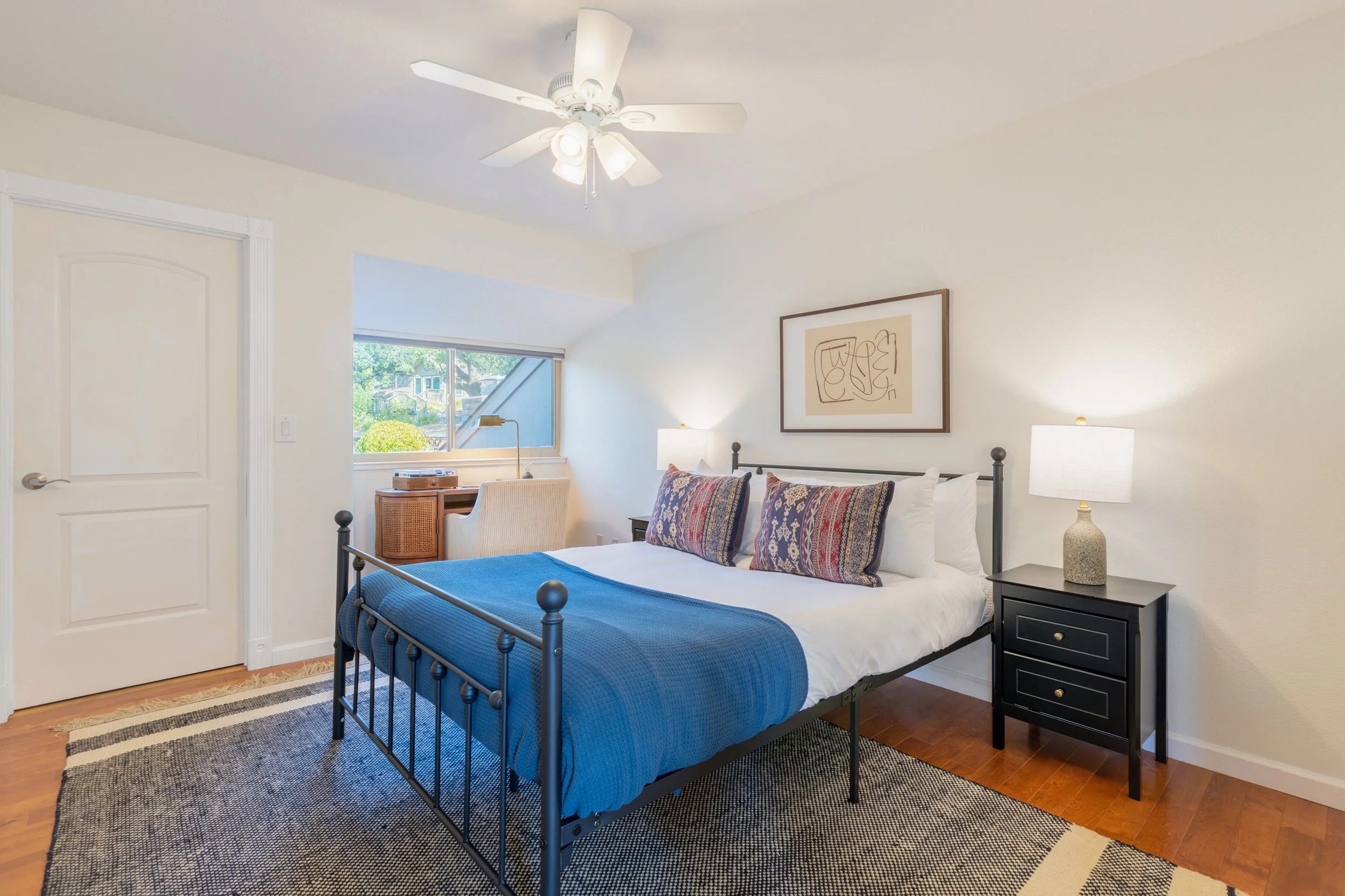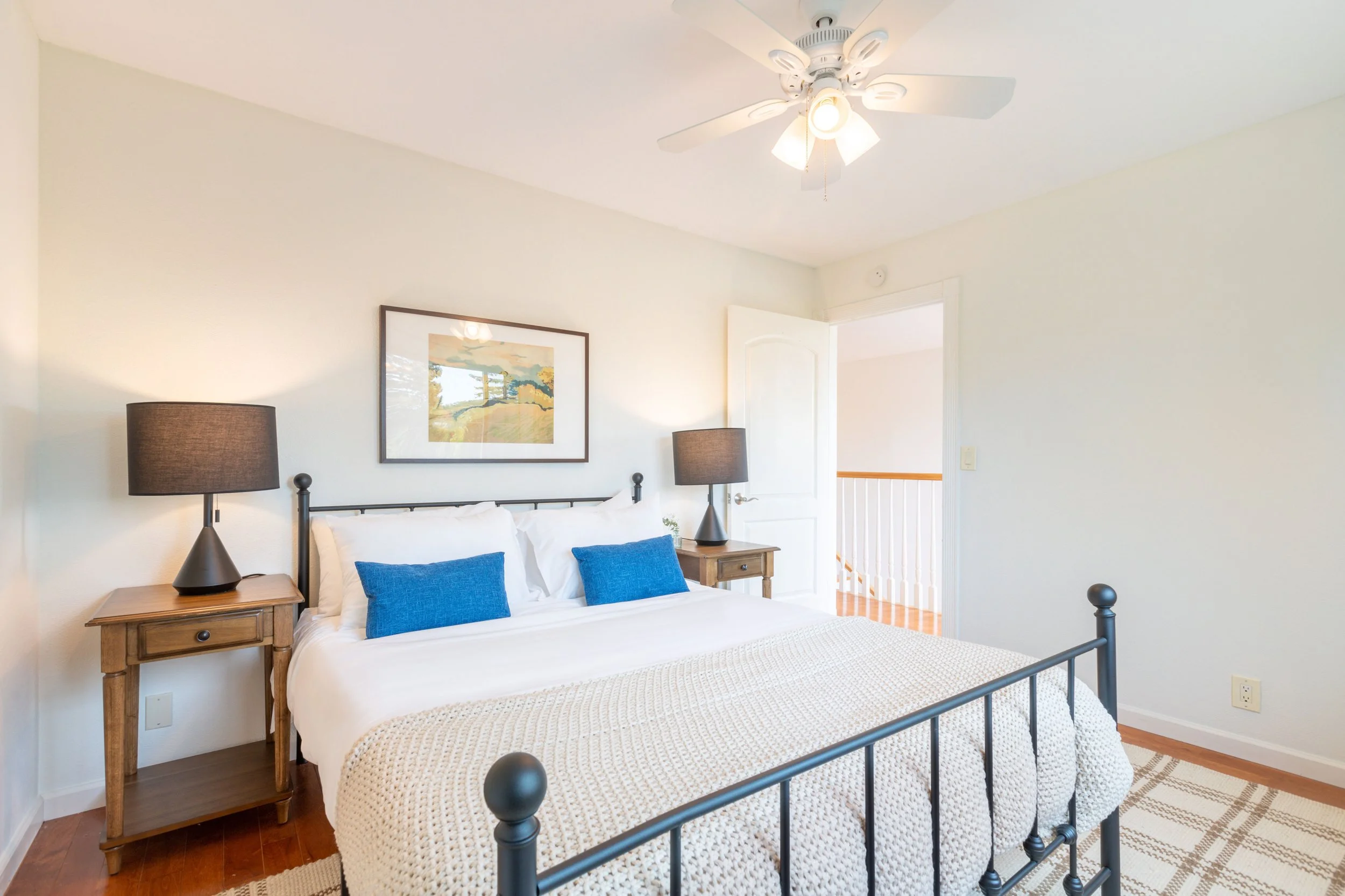 Bright bedroom with a black metal bed frame, white bedding, blue accent pillows, wooden side tables with black lamps, ceiling fan, and wall art.