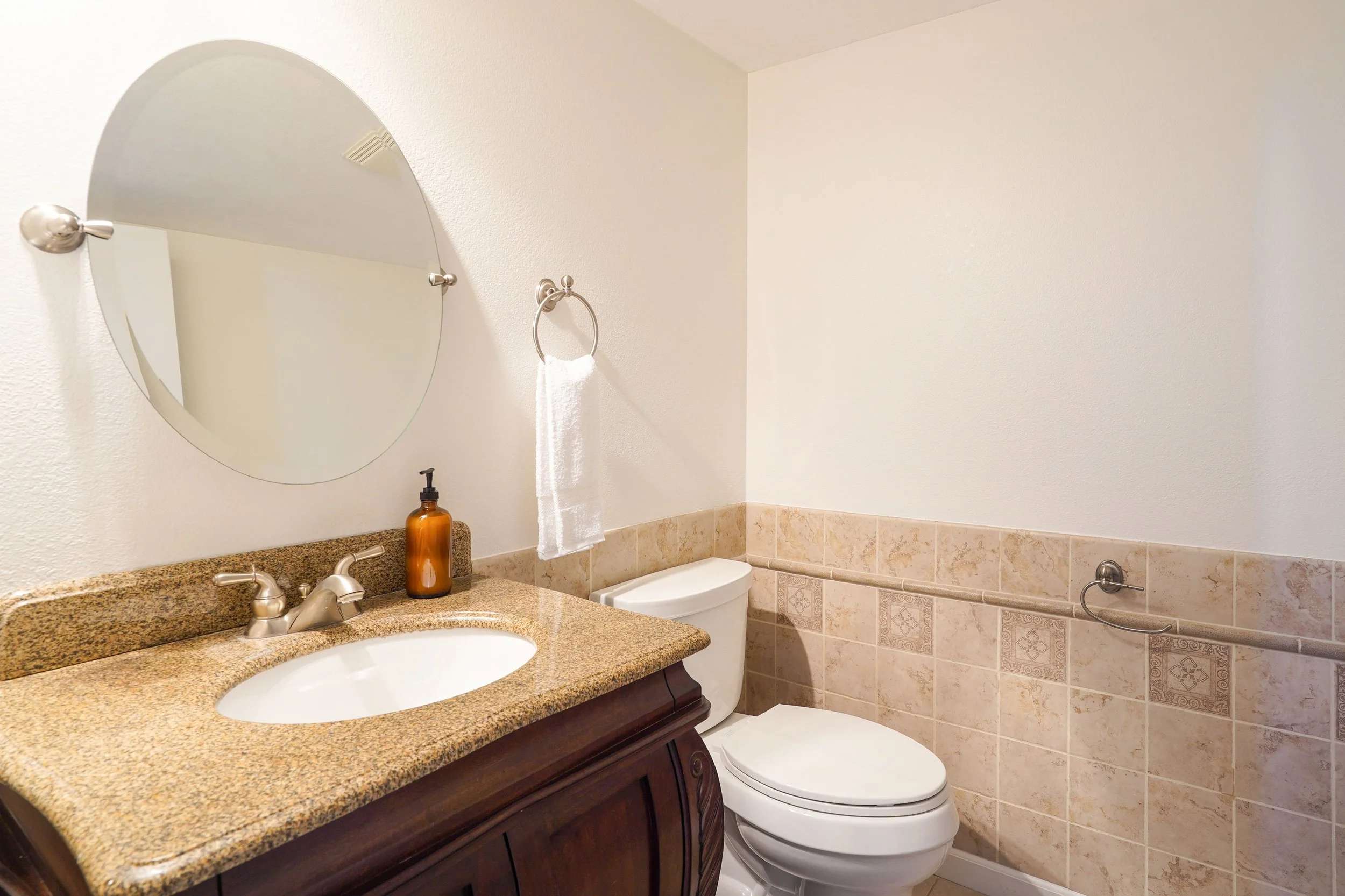 Bathroom with a round mirror, granite countertop, sink, faucet, soap dispenser, towel, toilet, and tiled walls. View fullsize