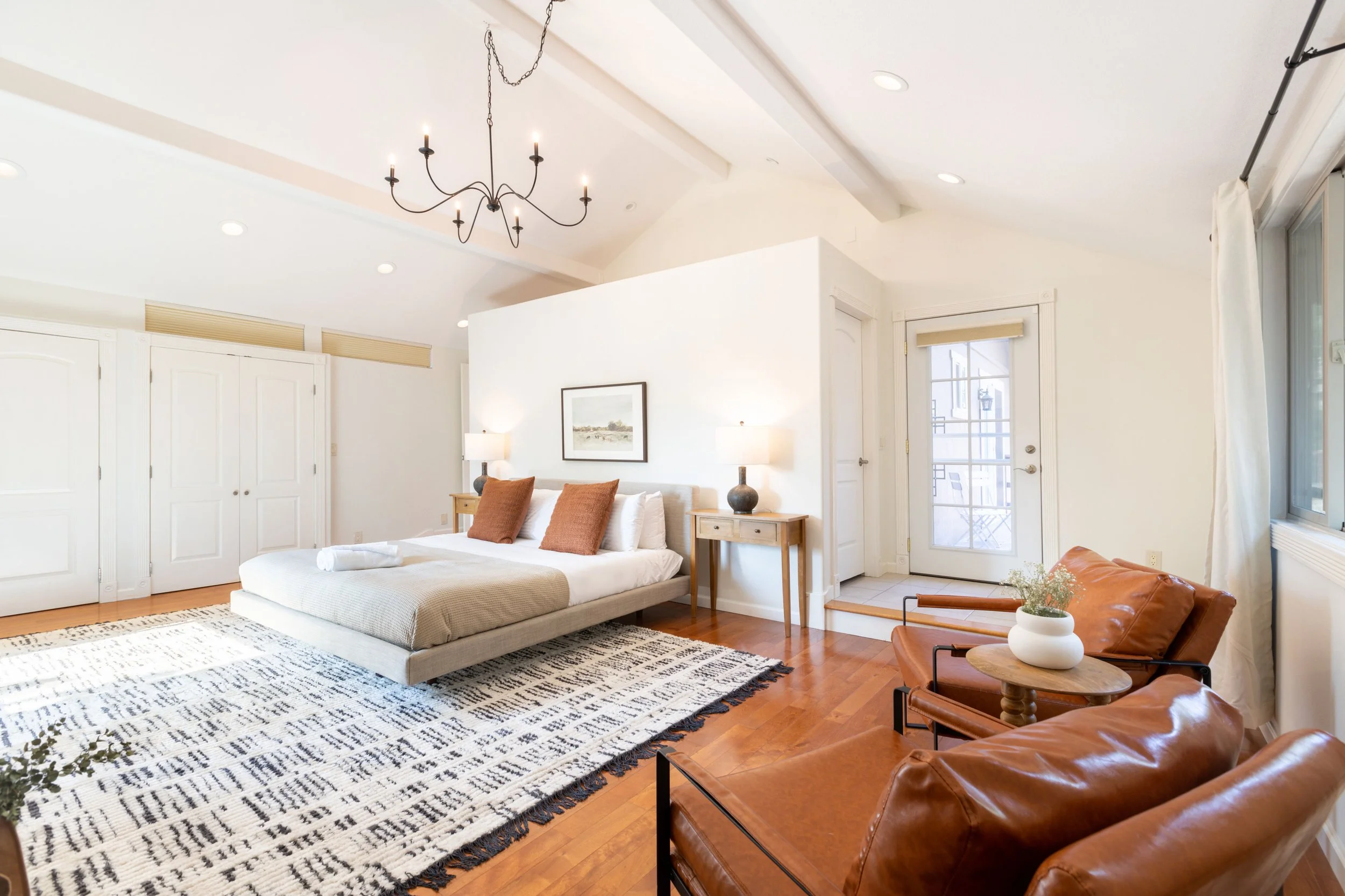 Spacious bedroom with large bed, brown pillows, white comforter, a patterned rug, and leather chairs. Features a modern chandelier, side tables with lamps, and a door leading outside.