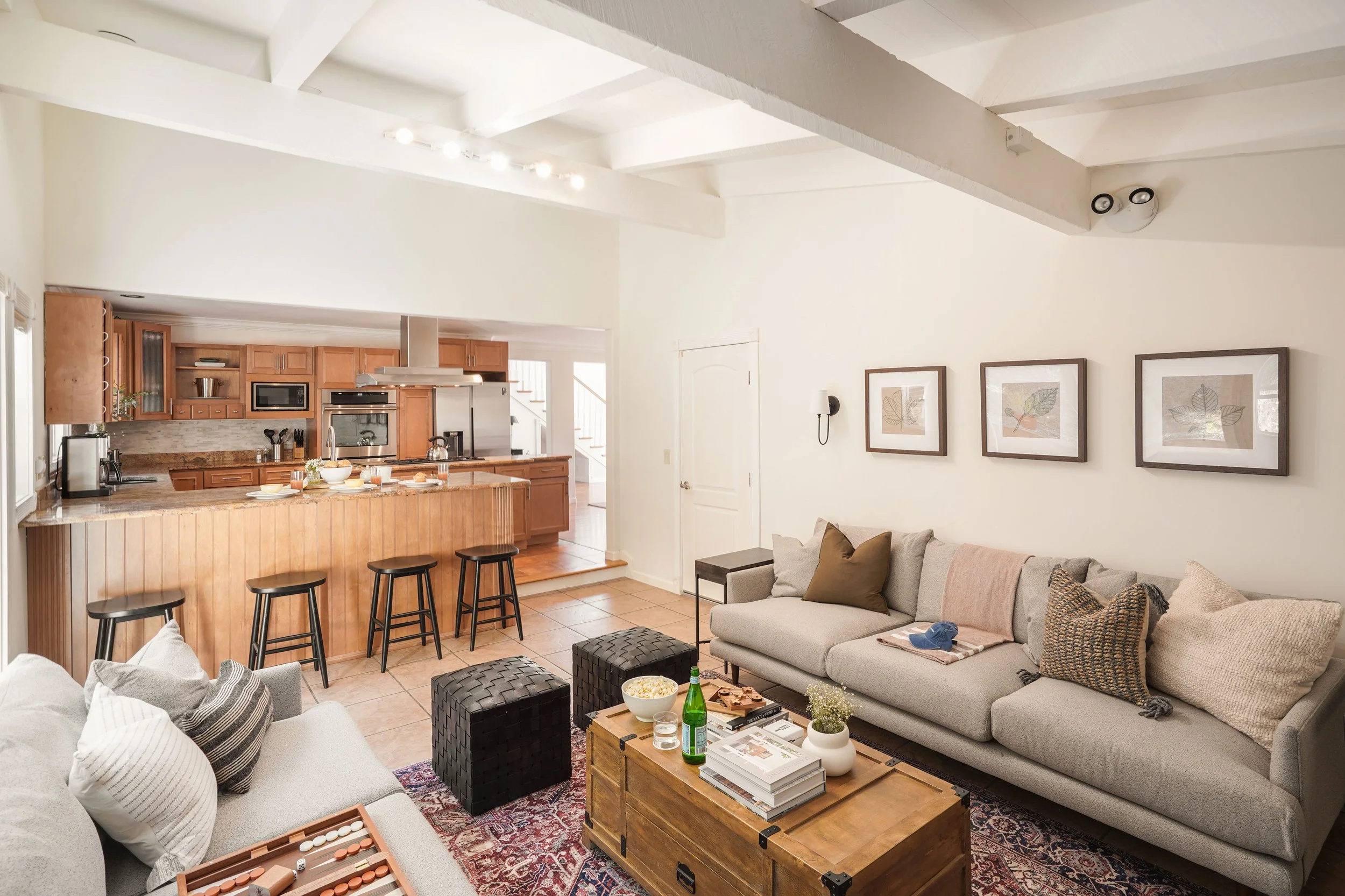 Spacious living room with beige sofas, patterned rug, wooden coffee table with books and drinks, and open kitchen with bar stools and wooden cabinets.
