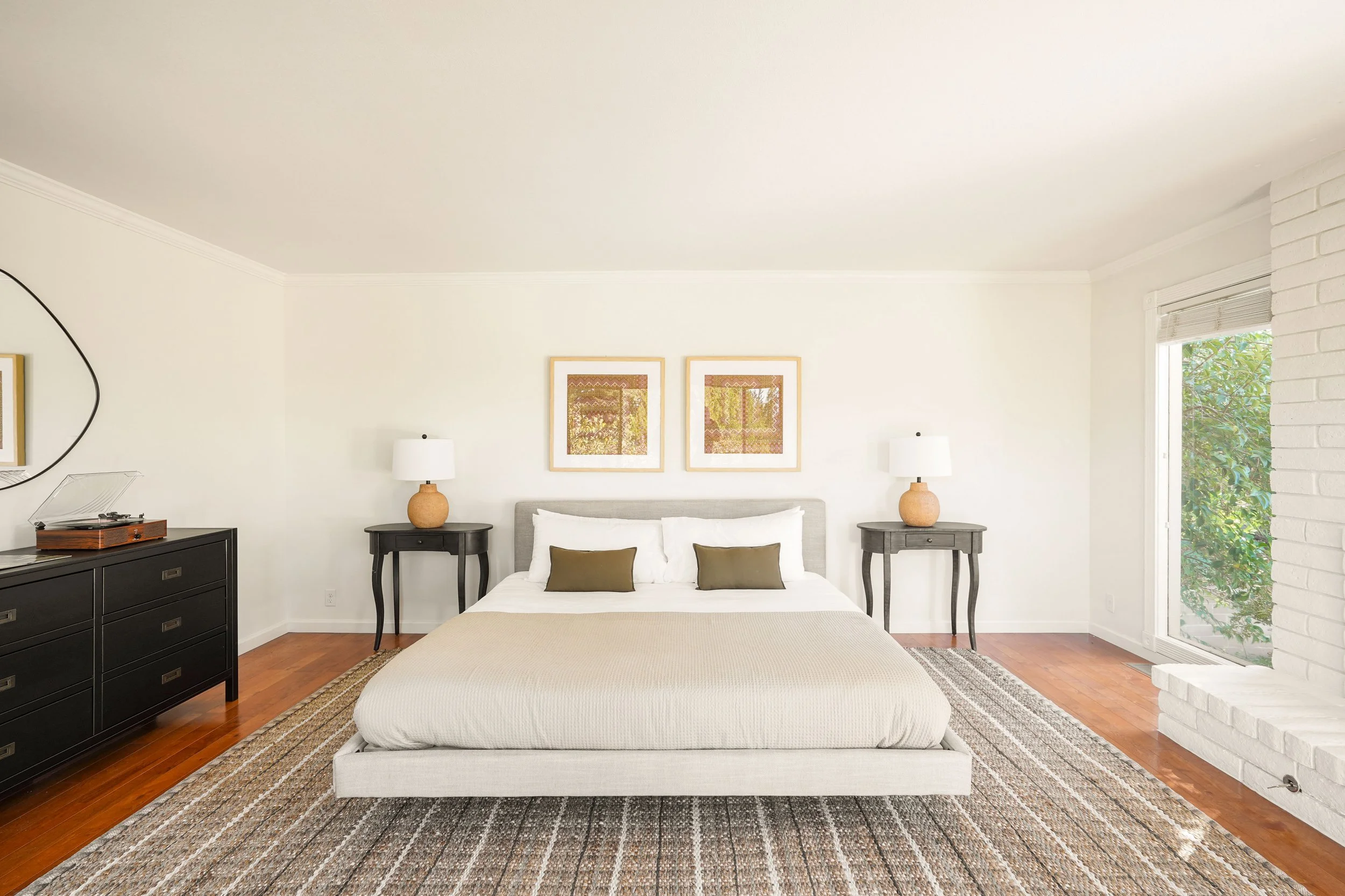Modern bedroom with a bed, two nightstands with lamps, wall art, dresser, and rug.