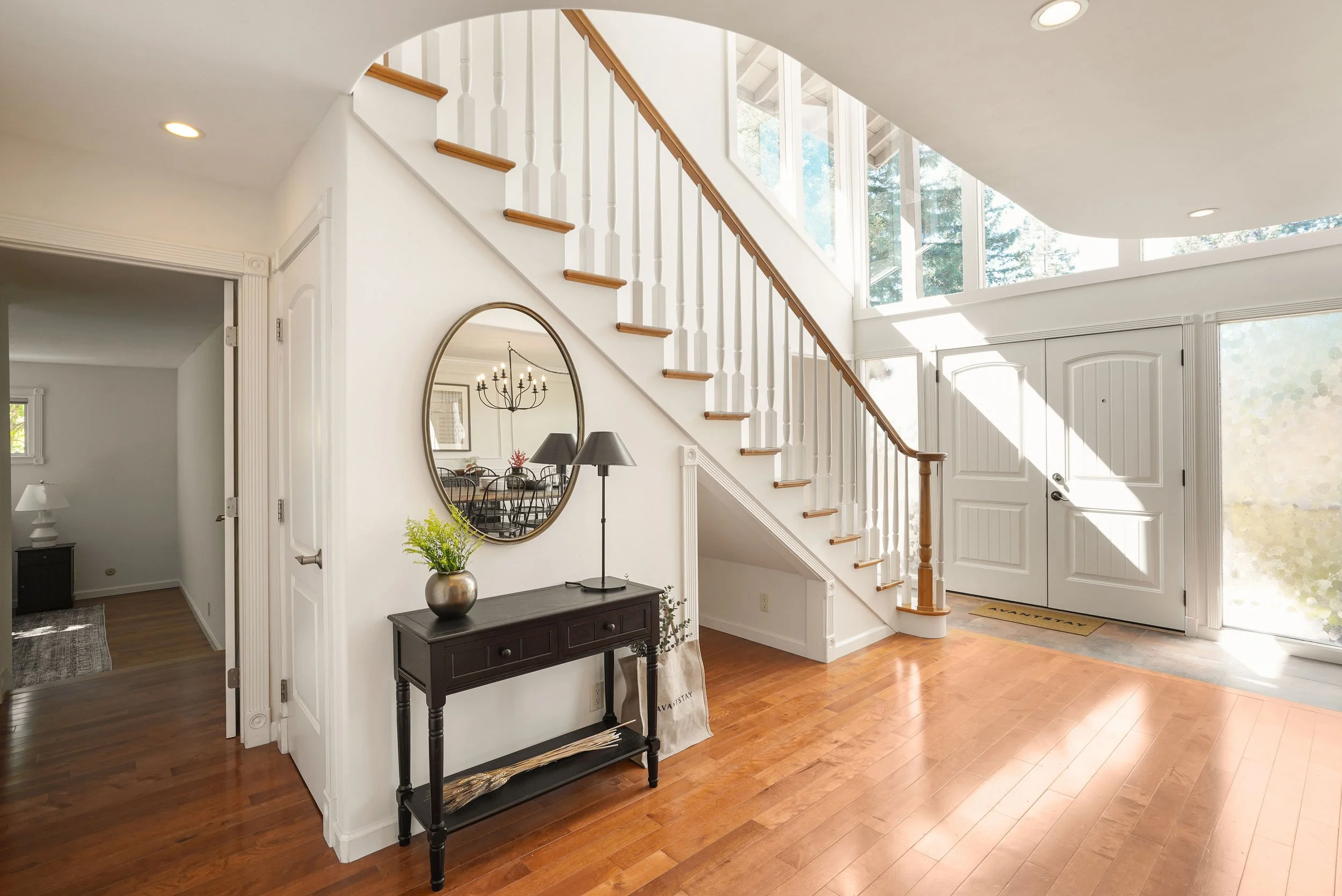 Modern home entryway with wooden staircase, round mirror, and console table.