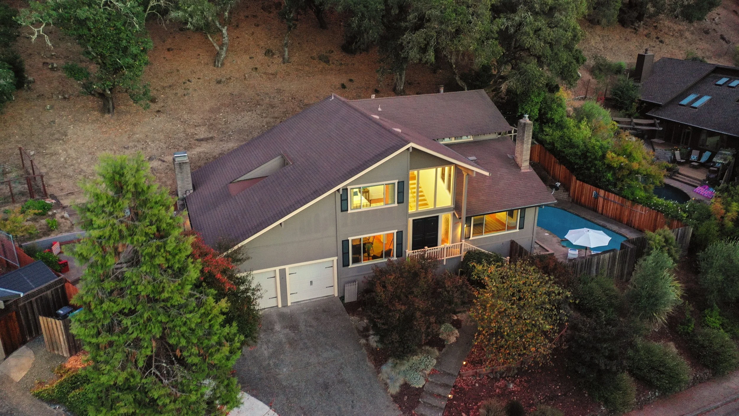 Aerial view of a suburban two-story house with a triangular roof, surrounded by trees, a fenced backyard, and a swimming pool with a white umbrella. The house features large windows and a visible two-car garage.