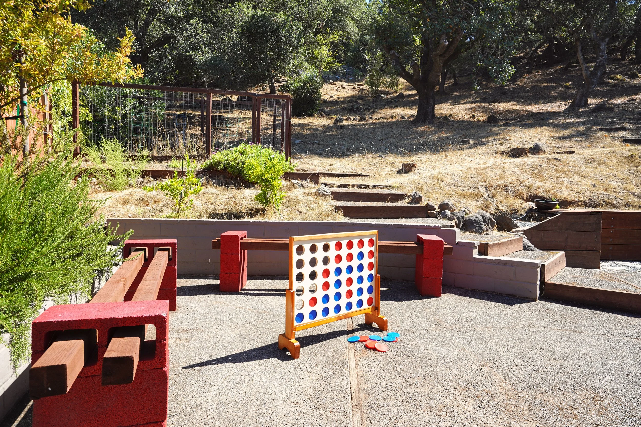 Outdoor area with a large Connect Four game, surrounded by benches and greenery.